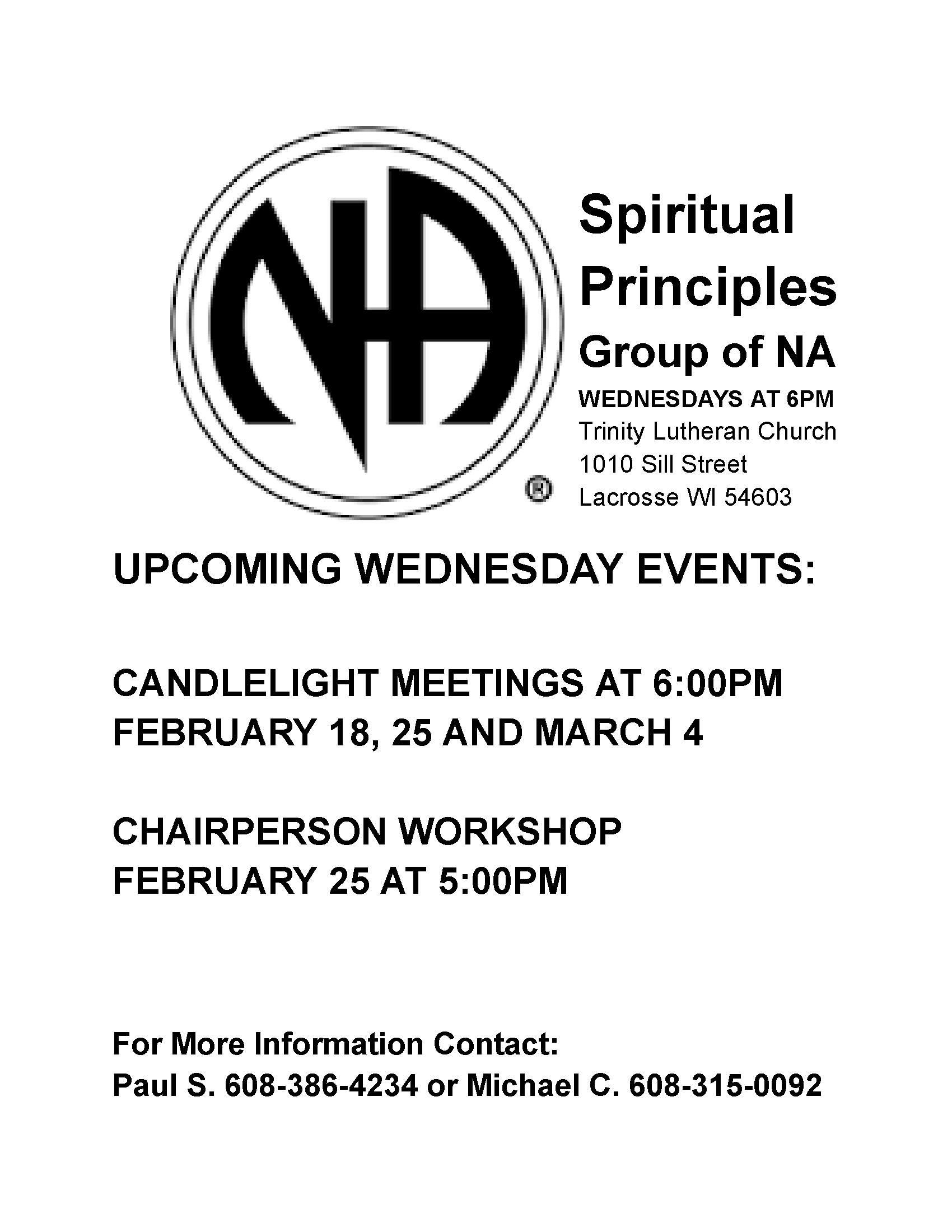 Candlelight Meetings + Add to Google Calendar + iCal / Outlook export 00 days 00 hours 00 minutes 00 seconds Date Feb 25 2026 Time 6:00 pm Local Time Timezone: America/New_York Date: Feb 25 2026 Time: 7:00 pm Location Trinity Lutheran 1010 Sill St. LaCrosse, WI 54601 Service Bodies Wisconsin Region Calendar Organizer Paul S. Phone (608) 386-4234 Other Organizers Michael C. Phone 608-315-0092 Printable Flyer