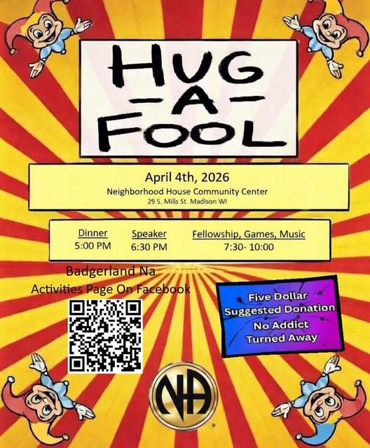 Hug-A-Fool + Add to Google Calendar + iCal / Outlook export 00 days 00 hours 00 minutes 00 seconds Hourly Schedule New Day 5:00 PM - 6:30 PM Dinner 6:30 PM - 7:30 PM Speaker 7:30 PM - 10:00 PM Fellowship, Games, Music Date Apr 04 2026 Time 5:00 pm - 10:00 pm Local Time Timezone: America/New_York Date: Apr 04 2026 Time: 6:00 pm - 11:00 pm Cost $5.00 Location Neighborhood House 29 South Mills St., Madison, WI 53715 Service Bodies Wisconsin Region Calendar Printable Flyer
