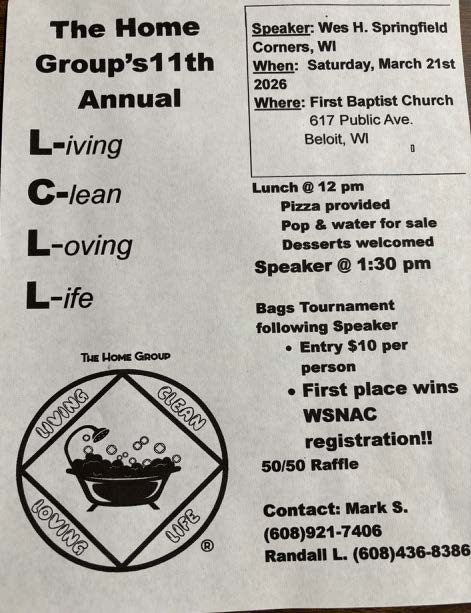 Living Clean Loving Life + Add to Google Calendar + iCal / Outlook export 00 days 00 hours 00 minutes 00 seconds Date Mar 21 2026 Time 12:00 pm Local Time Timezone: America/New_York Date: Mar 21 2026 Time: 1:00 pm Cost $10.00 Location First Baptist Church 617 Public Ave. Beloit, WI Service Bodies Wisconsin Region Calendar Organizer Mark S. Phone (608) 921-7406 Printable Flyer