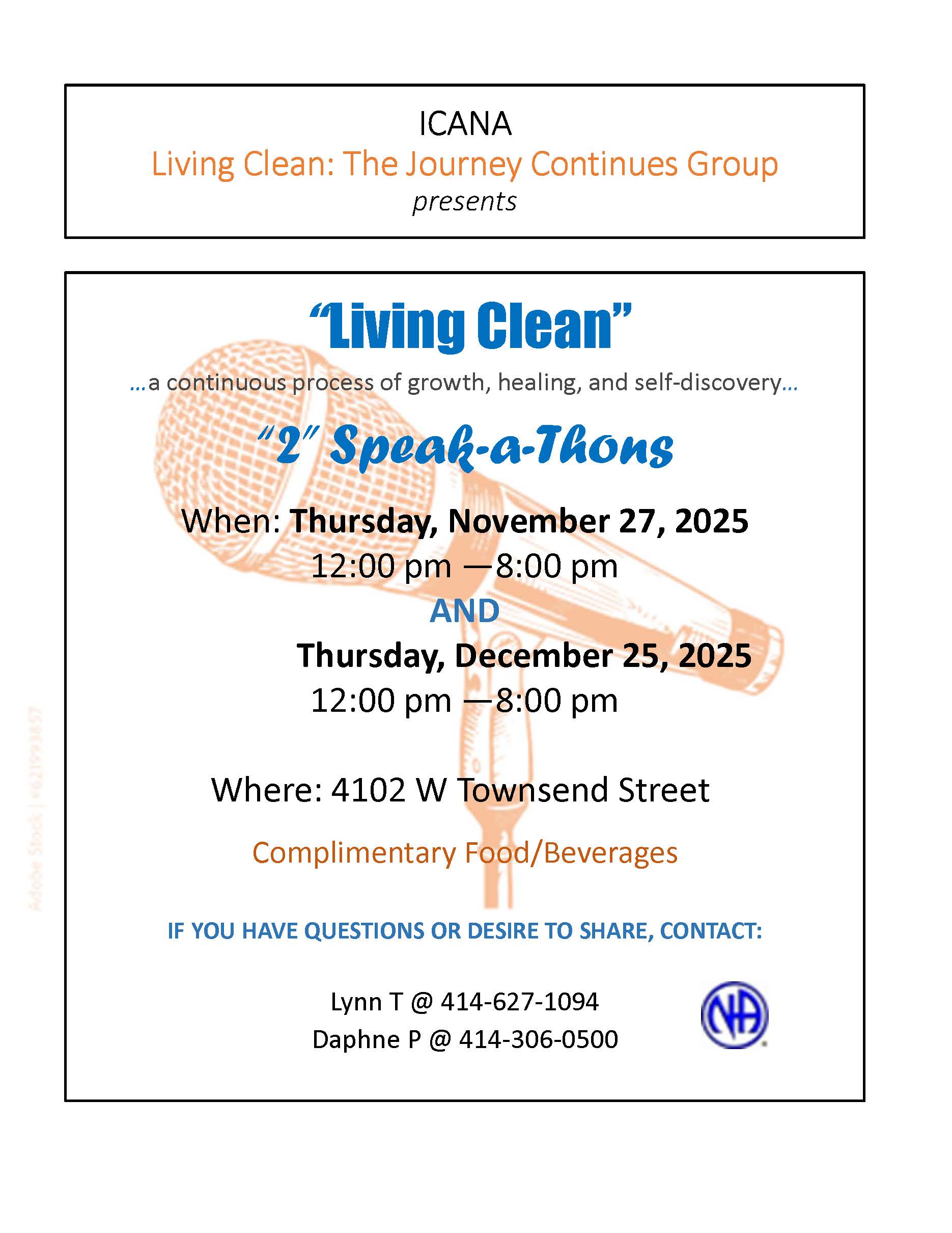 Living Clean Speak-a-Thon + Add to Google Calendar + iCal / Outlook export 00 days 00 hours 00 minutes 00 seconds Date Nov 27 2025 Time 12:00 pm - 8:00 pm Local Time Timezone: America/New_York Date: Nov 27 2025 Time: 1:00 pm - 9:00 pm Location 4102 W. Townsend St. Milwaukee, WI 4102 W. Townsend St. Milwaukee, WI 53216 Service Bodies Wisconsin Region Calendar Organizer Lynn T. Phone (414) 627-1094 Other Organizers Daphne P. Phone (414) 306-0500 Printable Flyer