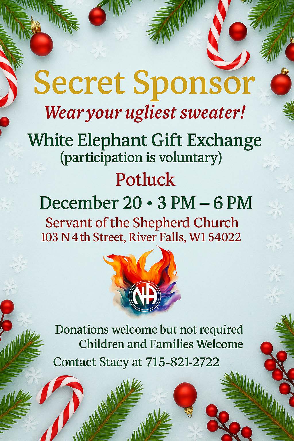 Secret Sponsor + Add to Google Calendar + iCal / Outlook export 00 days 00 hours 00 minutes 00 seconds Date Dec 20 2025 Time 3:00 pm - 6:00 pm Local Time Timezone: America/New_York Date: Dec 20 2025 Time: 4:00 pm - 7:00 pm Location Servant of the Shepherd Church 103 N 4th St, River Falls, WI 54022 Service Bodies Wisconsin Region Calendar Organizer Stacy Phone (715) 821-2172 Printable Flyer
