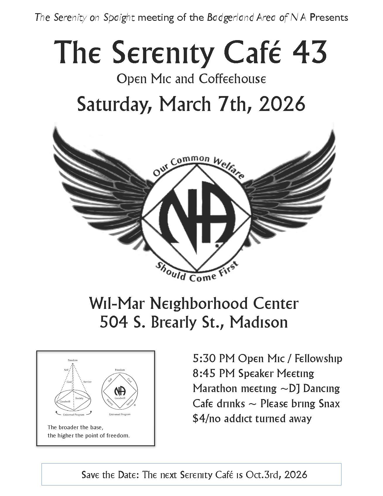 Serenity Cafe 43 + Add to Google Calendar + iCal / Outlook export 00 days 00 hours 00 minutes 00 seconds Date Mar 07 2026 Time 5:30 pm Local Time Timezone: America/New_York Date: Mar 07 2026 Time: 6:30 pm Cost $4.00 Location Wil-Mar Neighborhood Center 504 S. Brearly St. Madison, WI. 53703 Service Bodies Wisconsin Region Calendar Printable Flyer