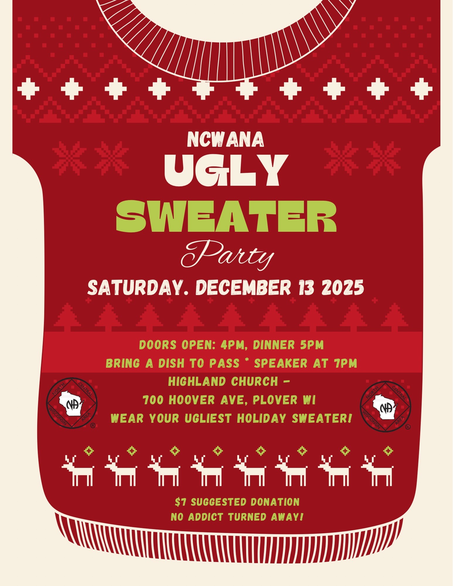 Ugly Sweater Party + Add to Google Calendar + iCal / Outlook export 00 days 00 hours 00 minutes 00 seconds Date Dec 13 2025 Time 4:00 pm Local Time Timezone: America/New_York Date: Dec 13 2025 Time: 5:00 pm Cost $7.00 Location Highland Church 700 Hoover Ave. Plover, WI 54467 Service Bodies Wisconsin Region Calendar Printable Flyer