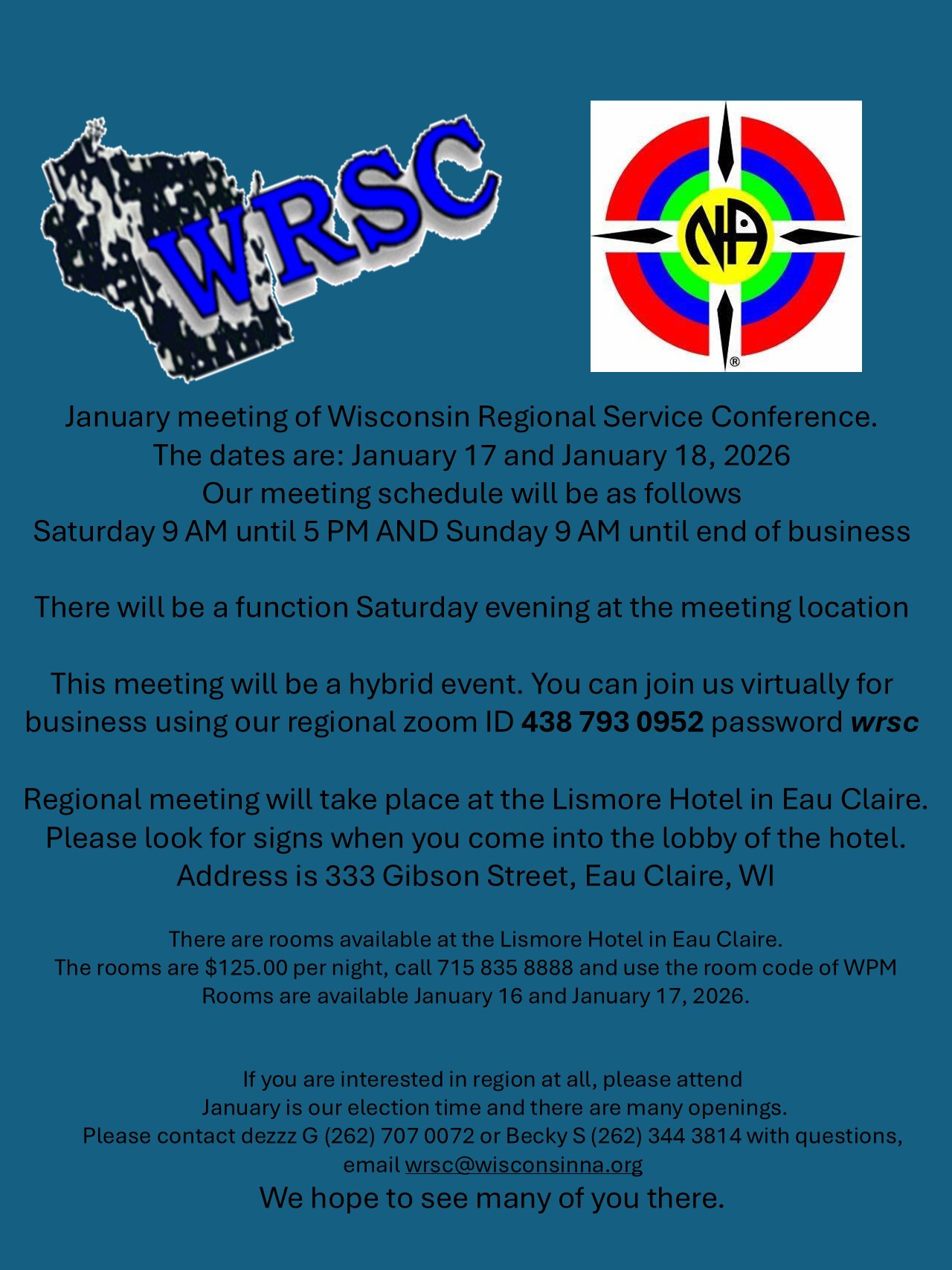 Wisconsin Region Service Conference Zoom Meeting Link + Add to Google Calendar + iCal / Outlook export 00 days 00 hours 00 minutes 00 seconds Date Jan 17 - 18 2026 Local Time Timezone: America/New_York Date: Jan 17 - 18 2026 Location Lismore Hotel 333 Gibson Street, Eau Claire, WI Service Bodies Wisconsin Region CalendarWisconsin Regional Service Committees Printable Flyer